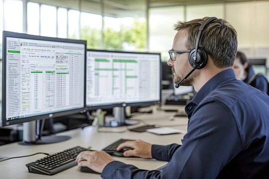 Man with headset analyzing digital charts and data