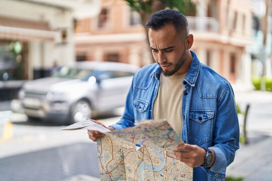 Indian young man tourist exploring city street, sightseeing holding paper map, check direction searching way looking for the route outdoors. Travel concept. Hispanic guy. Town lifestyles. Horizontal