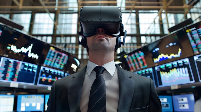 Businessman in VR Headset Interacting with Futuristic Data Visualizations and Graphs virtual reality