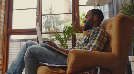 A man in a checkered shirt sits in an armchair, intently working on his laptop, surrounded by natural light in a modern home setting.