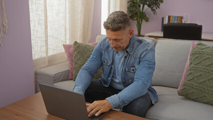 Middle age man working on laptop in home living room, showcasing a casual and relaxed indoor setting with bright natural light from large windows.