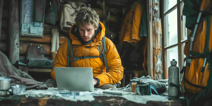 Freelancer working remotely from rustic cabin enjoying nomadic lifestyle