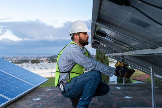 Male engineer in blue suit and protective helmet installing photovoltaic panel system using screwdriver. Professional electrician mounting solar module on roof. Alternative energy ecological concept.