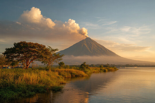 A striking view of Momotombo volcano with smoke rising and Lake Managua glistening in the foreground at sunrise.