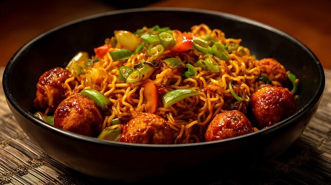 Schezwan noodles with Manchurian balls served hot in bowl showing colorful Indo Chinese food in warm setting