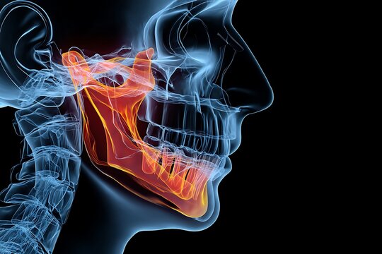 3d rendering of the human jaw bone anatomy, highlighting the mandible, maxilla, and temporomandibular joint for medical use