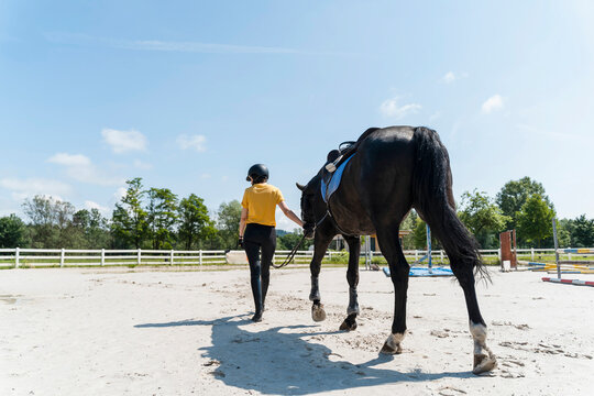 Instructor walking with black horse at manege square