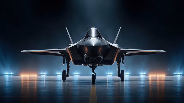 A sleek, modern military aircraft stands ready on a runway, illuminated by dramatic lighting, showcasing its design and advanced technology.