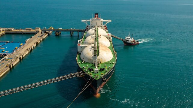 Aerial view of a massive lng tanker ship docked at a port terminal with a tugboat assisting its maneuverability in the ocean