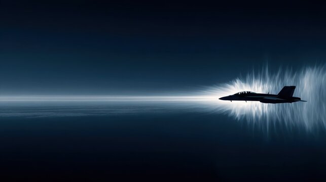 A sleek jet aircraft flying at high speed, creating a dynamic visual effect against a dark, atmospheric backdrop.
