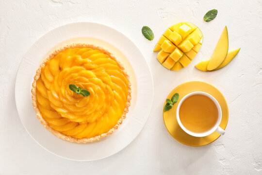 Delicious glazed mango no baked cheese cake with fresh diced mango pulp topping on bright table background.