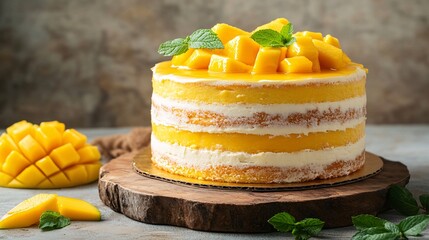 A vibrant mango mousse cake with layers of soft sponge and a creamy mango mousse filling. The cake is topped with a glossy mango glaze and a few slices of fresh mango, adding a burst of color and a