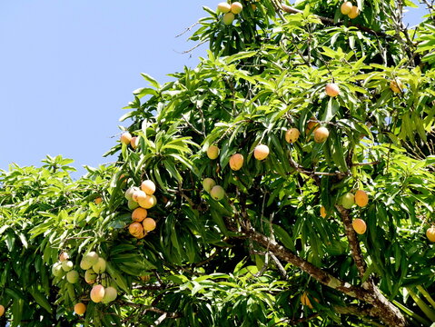 Large mango tree with lush green leaves standing prominently on vast grassy ground under a bright blue sky with fluffy clouds near a summer road.