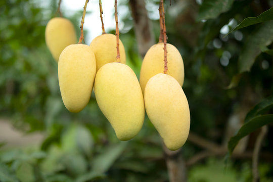 Ripe delicious mango growing on a tree, close-up