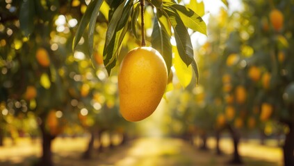 Tropical ripe yellow mango fruit hanging on tree branch with beautiful farm and sunlight on background. Mango product and Dessert concept.