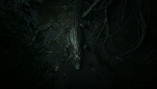 Nocturnal crocodilian lying in mangrove swamp under moody green overhead lighting