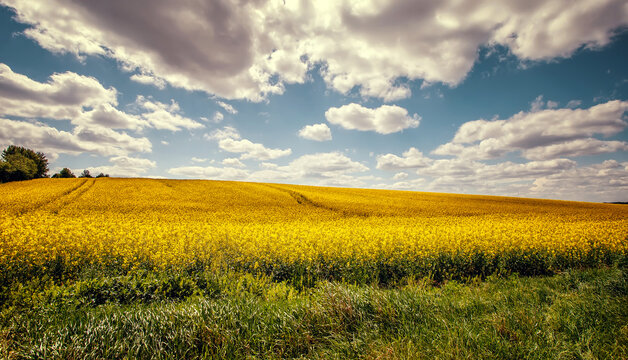 Wonderful Agricultural Landscape. Canola Field with perfect blue sky at sunny day. The idea of a Rich Harvest Concept. Rural Landscape under Shining Sunlight. Used as  background