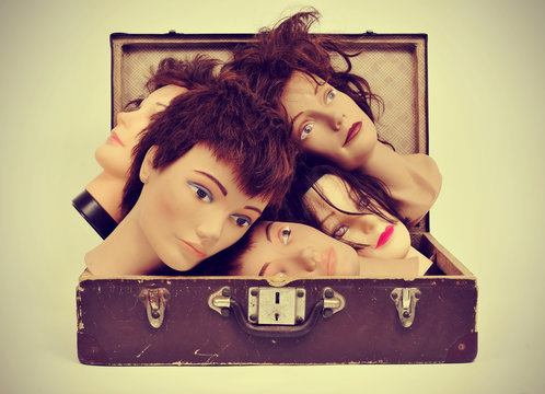 group of 3 naked and bald store window mannequins or display dummies with realistic faces