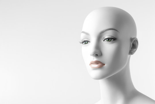 A white painted female mannequin head on a soft background, with features highlighted by the side lighting. Closeup plastic mannequin heads against blurred background. Shallow focus.