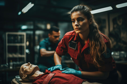 young female doctor practices artificial respiration and cardiac massage on a mannequin