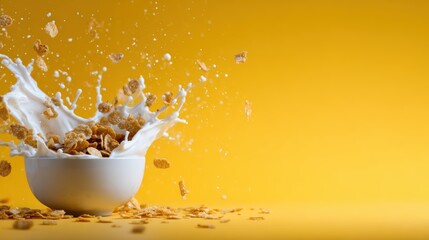 A bowl of crunchy cereal experiences a dramatic splash of milk, capturing the joy of breakfast in a vibrant and energetic manner against a bright yellow background.