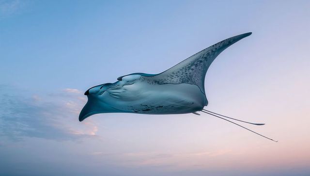 Manta ray gliding across pastel twilight sky with broad sweeping wing fins