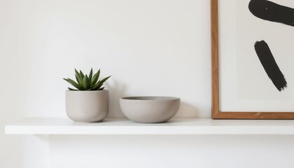 Modern mantel decor featuring minimalist plant and pottery on a clean white shelf