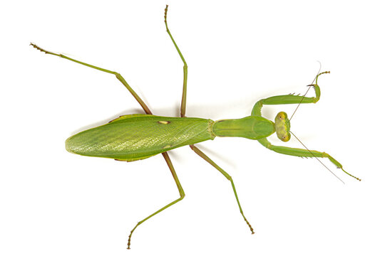 Isolated green praying mantis insect posed against a clean backdrop on a bright day in nature