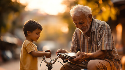 Intergenerational Activity: Senior man teaching kid to repair bicycle with digital manual
