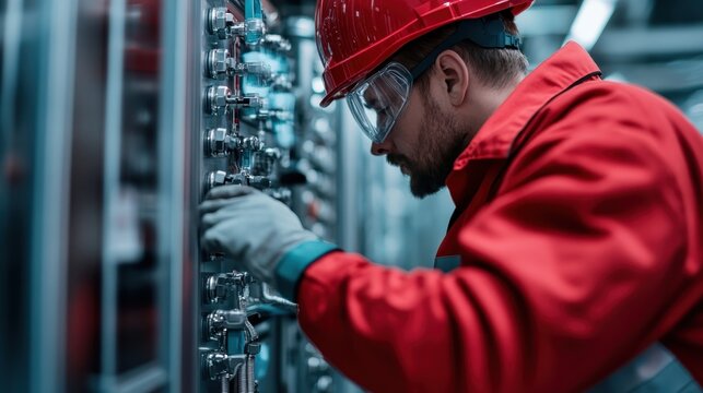 Worker in hard hat adjusting machinery in industrial setting. Focus on manual labor and technology.