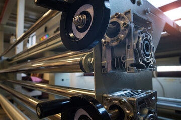 Part of a machine with metal rollers and a black manual adjustment wheel. selective focus