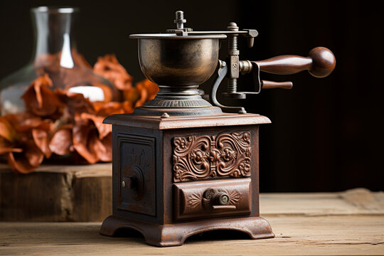 Vintage Coffee Grinder with Fresh Coffee in Rustic Dark Wood Setting