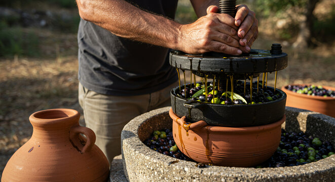 Person manually pressing olives to extract oil outdoors