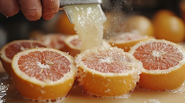 Hyper-detailed 8K man juicing grapefruits using a manual press in a sunny kitchen