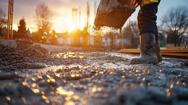 Dynamic Construction Worker Pouring Concrete at Sunset