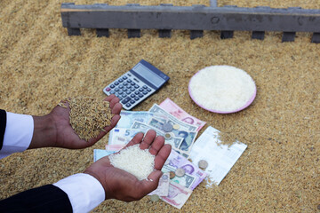 Currency and Rice Grains: Farming Investment and Earnings Concept