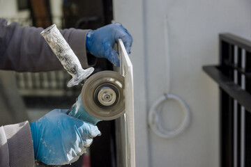 Man cutting square hole for electrical outlet in the tile shape using angle grinder