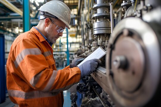 A worker in safety gear examines machinery in an industrial setting.