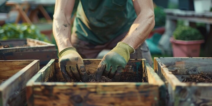 Man is working in a garden, wearing gloves and tending to a box of dirt. Concept of hard work and dedication to gardening