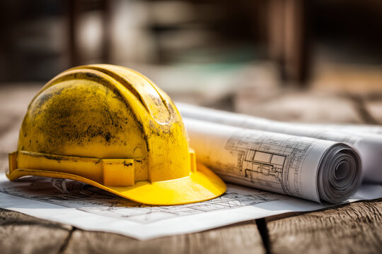 Worn yellow construction helmet resting on top of architectural blueprints beside rolled plans on a wooden surface in a workshop setting