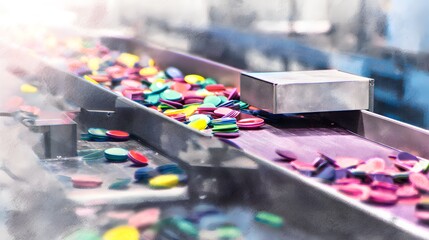 A conveyor belt transports golden material, a steady flow showcasing the industrial process with focused depth and metallic undertones.