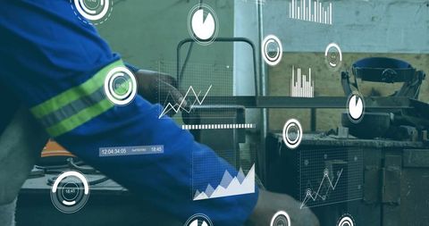 Engineer using tablet in manufacturing facility with analytics overlay
