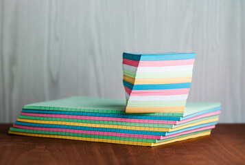 Different coloured note paper and pads stacked on wooden desk
