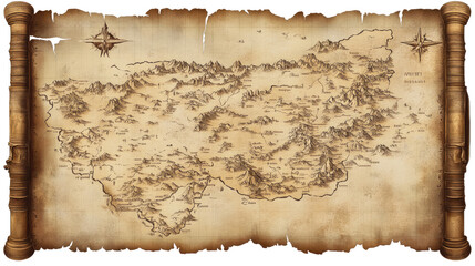 Ancient Treasure Map:  A weathered, antique treasure map unfolds, revealing a mysterious land with mountains, valleys, and rivers, hinting at hidden riches and untold adventures.