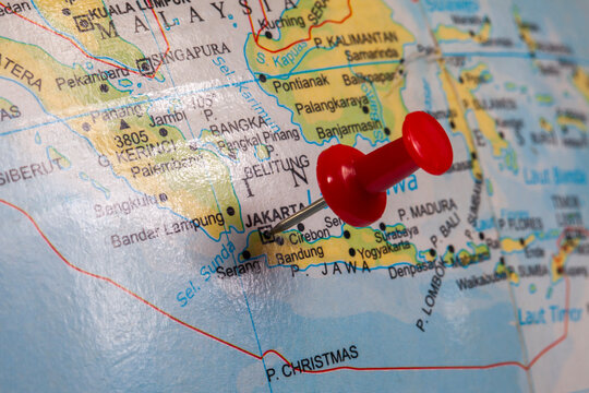 The city of Jakarta and Indonesia as a whole on a globe map is marked by a red pin as a location indicator. Jakarta is the capital and most important city in Indonesia.