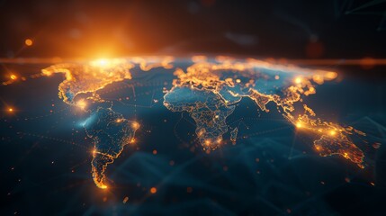 A glowing map of the world, with city lights and a rising sun, symbolizing global connection and progress.