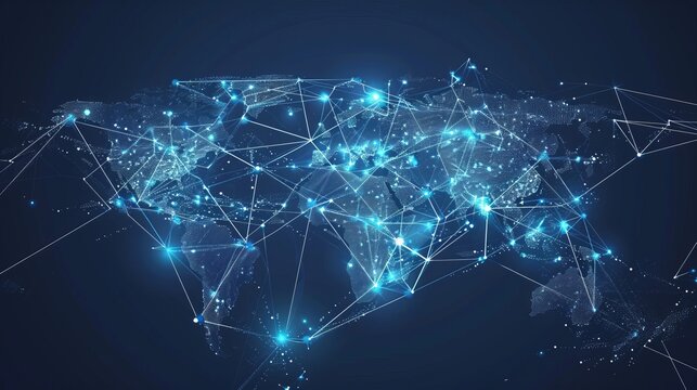 Abstract world map with dotted lines connecting major cities across continents on a vibrant blue gradient background representing global communication