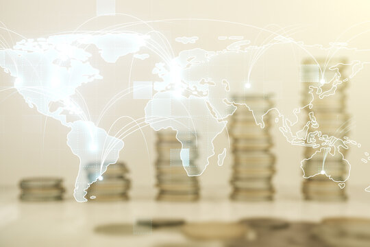 Global markets overview with dynamic financial data overlaying a detailed world map background, highlighting key economic regions