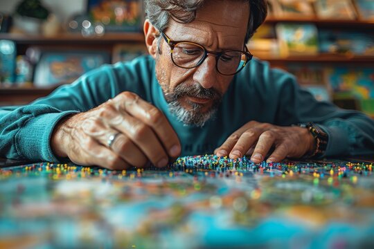 Mature man analyzing global data visualization with futuristic map overlay and analytics