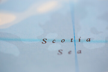 Shallow depth of field focus on geographical map location of Scotia Sea off coast of Argentina on atlas